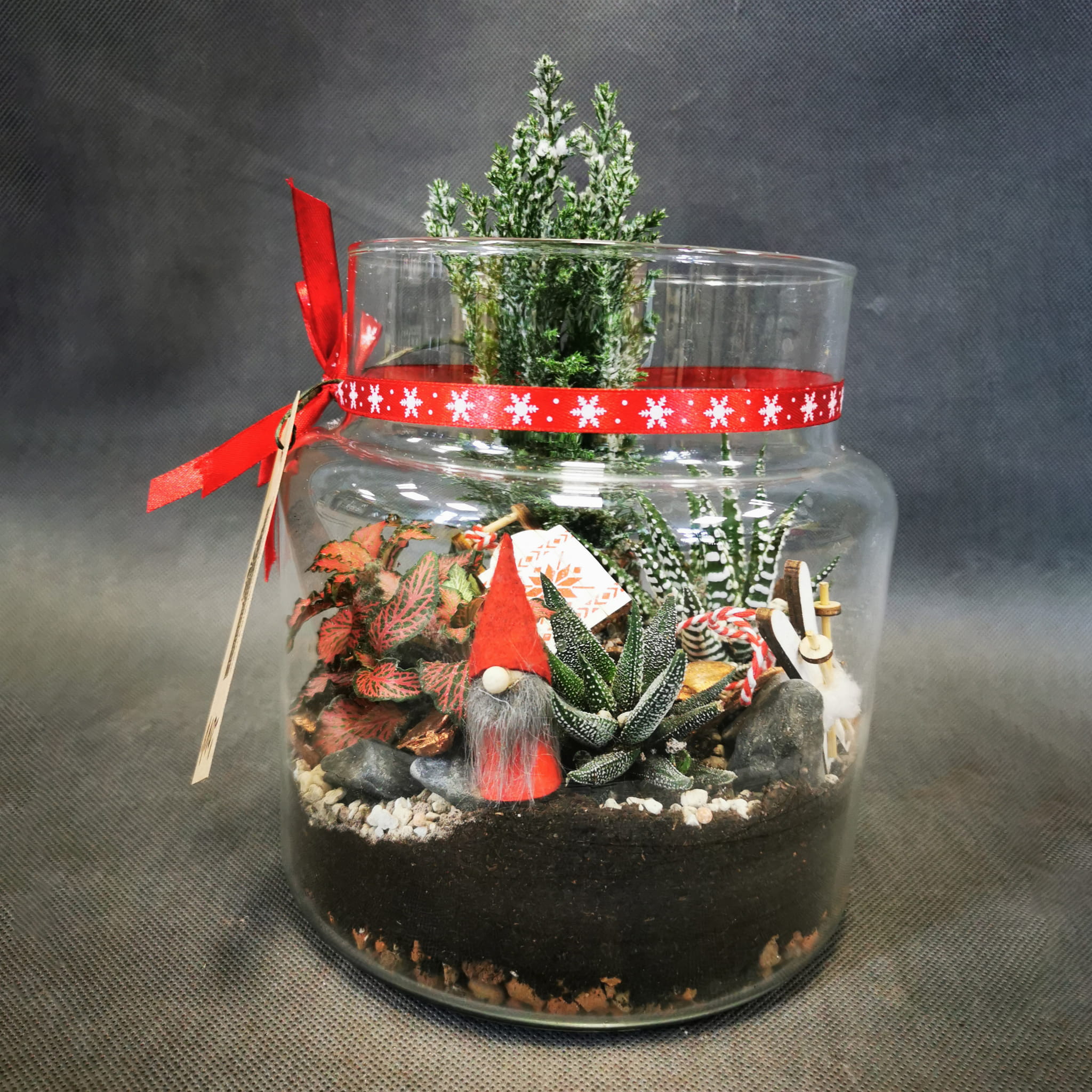 Mały las w szkle w klimacie świątecznym, 3-4 roślinki zasadzone w szklanym naczyniu (wysokość ok. 20cm), do tego kamyczki w różnych rozmiarach oraz 3-4 elementy świąteczne, całość ozdobiona kokardą.