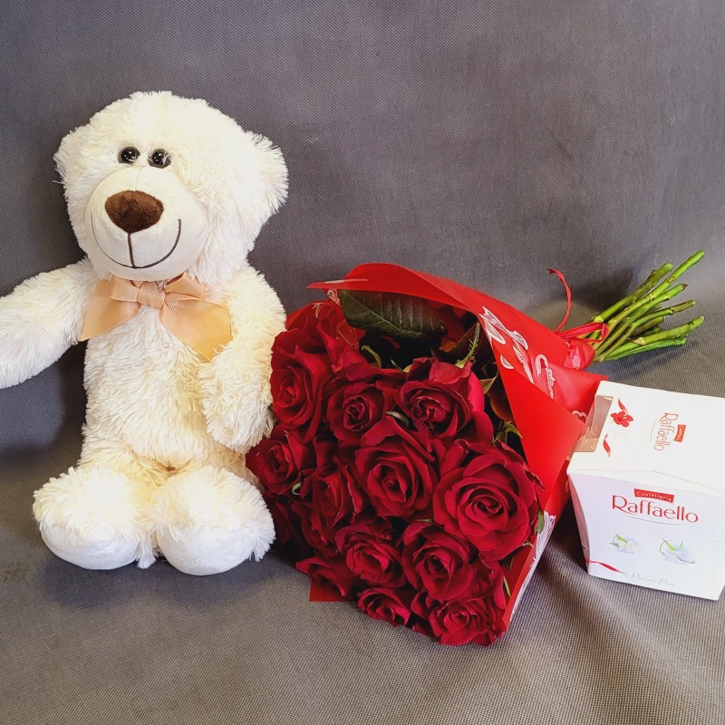 Bukiet 12 czerwonych róż z pluszowym misiem i Raffaello to wyjątkowy zestaw pełen miłości i słodyczy. Eleganckie róże symbolizują głębokie uczucia, miś dodaje uroku i ciepła, a delikatne praliny podkreślają subtelność gestu. Idealny prezent na romantyczne okazje, wyrażający troskę i namiętność.