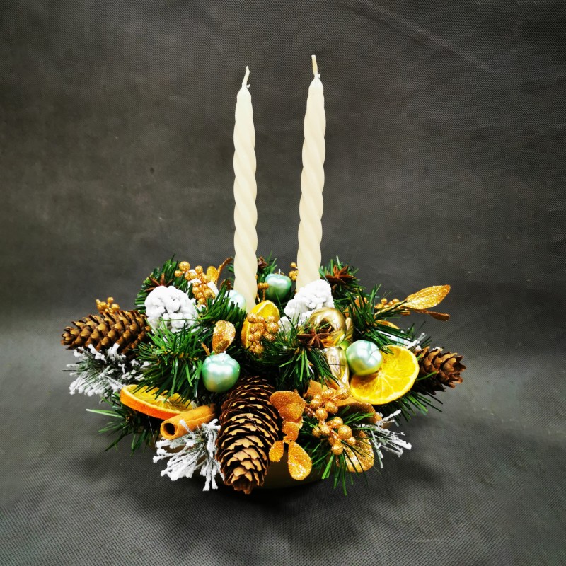 Stroik świąteczny wykonany ze sztucznych gałązek choinkowych oraz elementów w kolorze złotym i zielonym, z dodatkiem szyszek i suszonych pomarańczy, świece długie w kolorze kremowym.