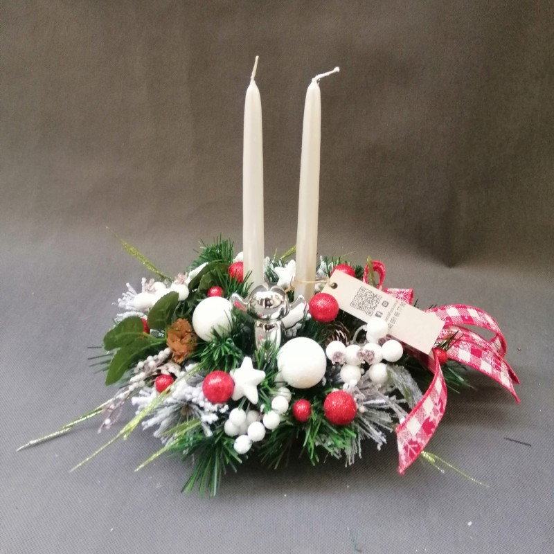 Stroik świąteczny wykonany ze sztucznych gałązek choinkowych oraz elementów w kolorze białym, srebrnym i czerwonym, z dodatkiem szyszek i dużą kokardą, świece podłużne w kolorze białym.