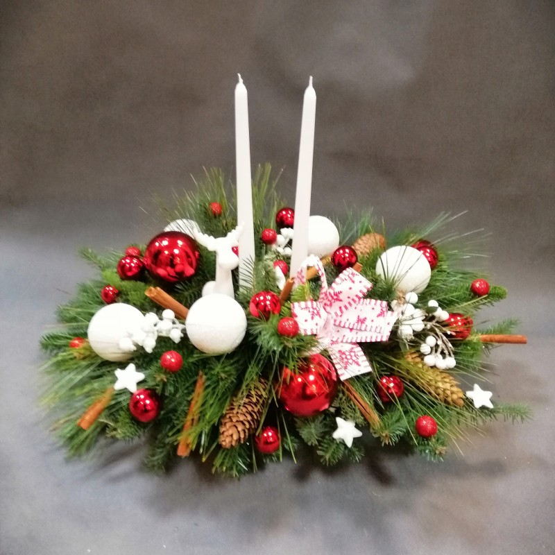 Stroik świąteczny wykonany ze świeżych gałązek choinkowych (jodła nobilis, wejmutka) oraz elementów w kolorze białym i czerwonym, z dodatkiem szyszek, lasek cynamonu i dużą kokardą, świece podłużne w kolorze białym.