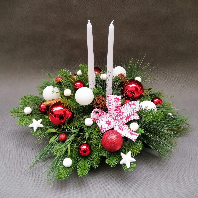 Stroik świąteczny wykonany ze świeżych gałązek choinkowych (jodła nobilis, wejmutka) oraz elementów w kolorze białym i czerwonym, z dodatkiem szyszek i dużą kokardą, świece podłużne w kolorze białym.