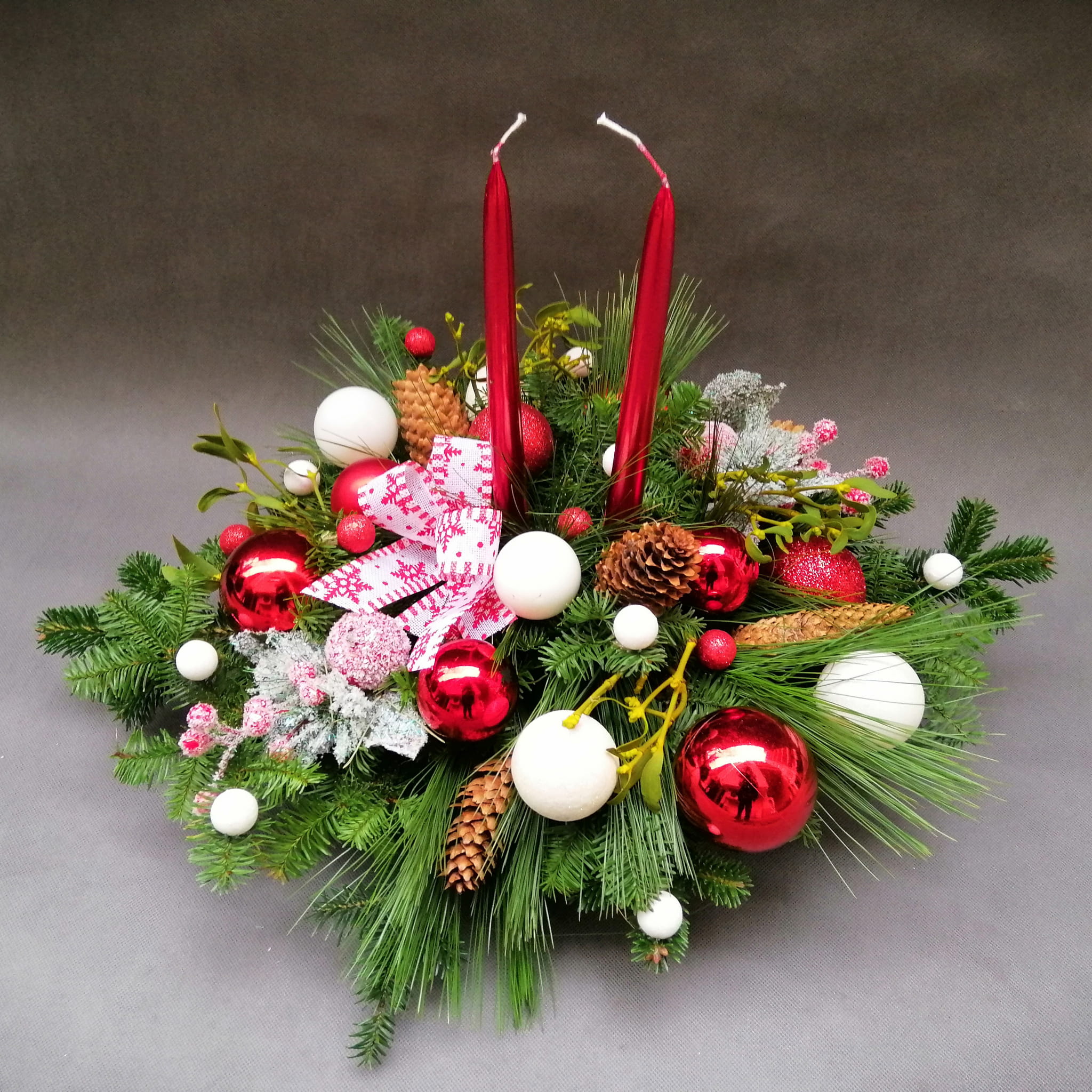 Stroik świąteczny wykonany ze świeżych gałązek choinkowych (jodła nobilis, wejmutka) oraz elementów w kolorze białym i czerwonym, z dodatkiem szyszek, jemioły i dużą kokardą, świece podłużne w kolorze czerwonym.