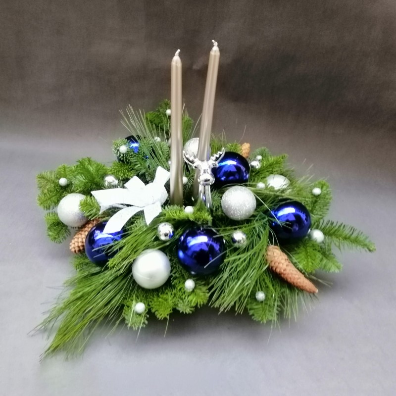 Stroik świąteczny wykonany ze świeżych gałązek choinkowych (jodła nobilis, wejmutka) oraz elementów w kolorze srebrnym i granatowym, z dodatkiem szyszek i dużą kokardą, świece podłużne w kolorze srebrnym.
