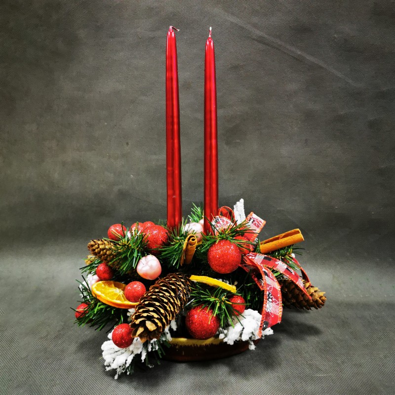 Stroik świąteczny wykonany ze sztucznych gałązek choinkowych oraz elementów w kolorze czerwonym, z dodatkiem szyszek, suszonych pomarańczy i lasek cynamonu, świece długie w kolorze czerwonym.