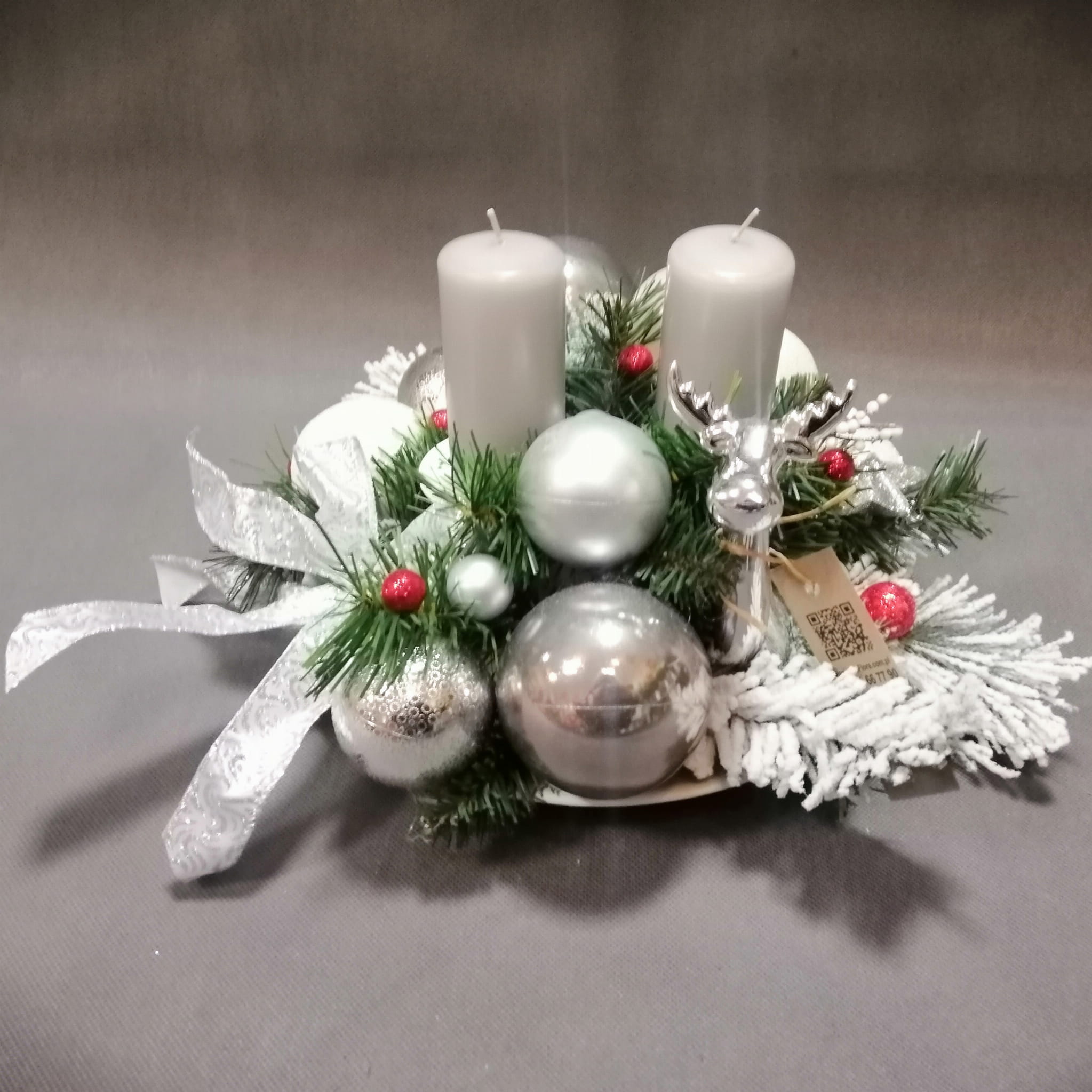 Stroik świąteczny wykonany ze sztucznych gałązek choinkowych i elementów w kolorze srebrnym i czerwonym, z dużą kokardą, świece walcowe szare.