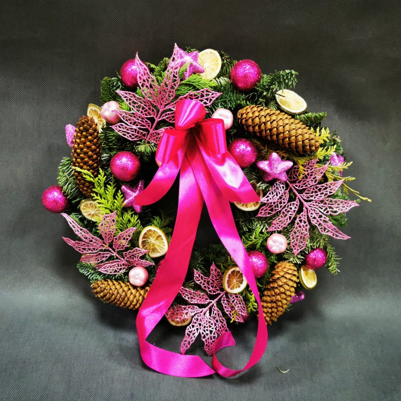 Wianek świąteczny wykonany ze świeżych gałązek choinkowych na słomianym podkładzie, z elementami w kolorze różowym, z dodatkiem szyszek i suszonych cytryn, z dużą kokardą.