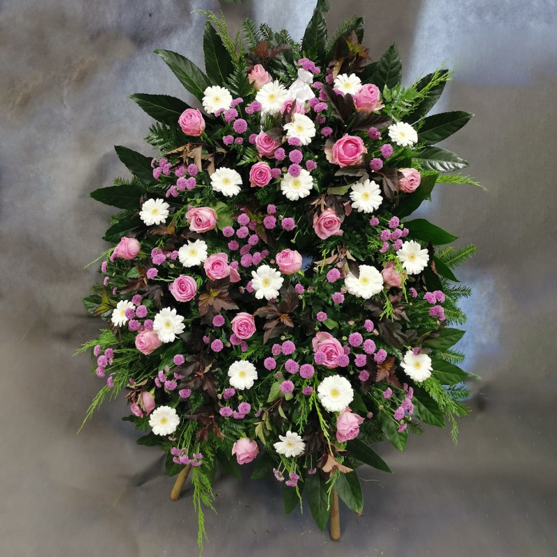 Wieniec stojący wykonany na podkładzie z igliwia i liści, kwiat w kolorze białym i różowym (róża, margerytka i gerbera).